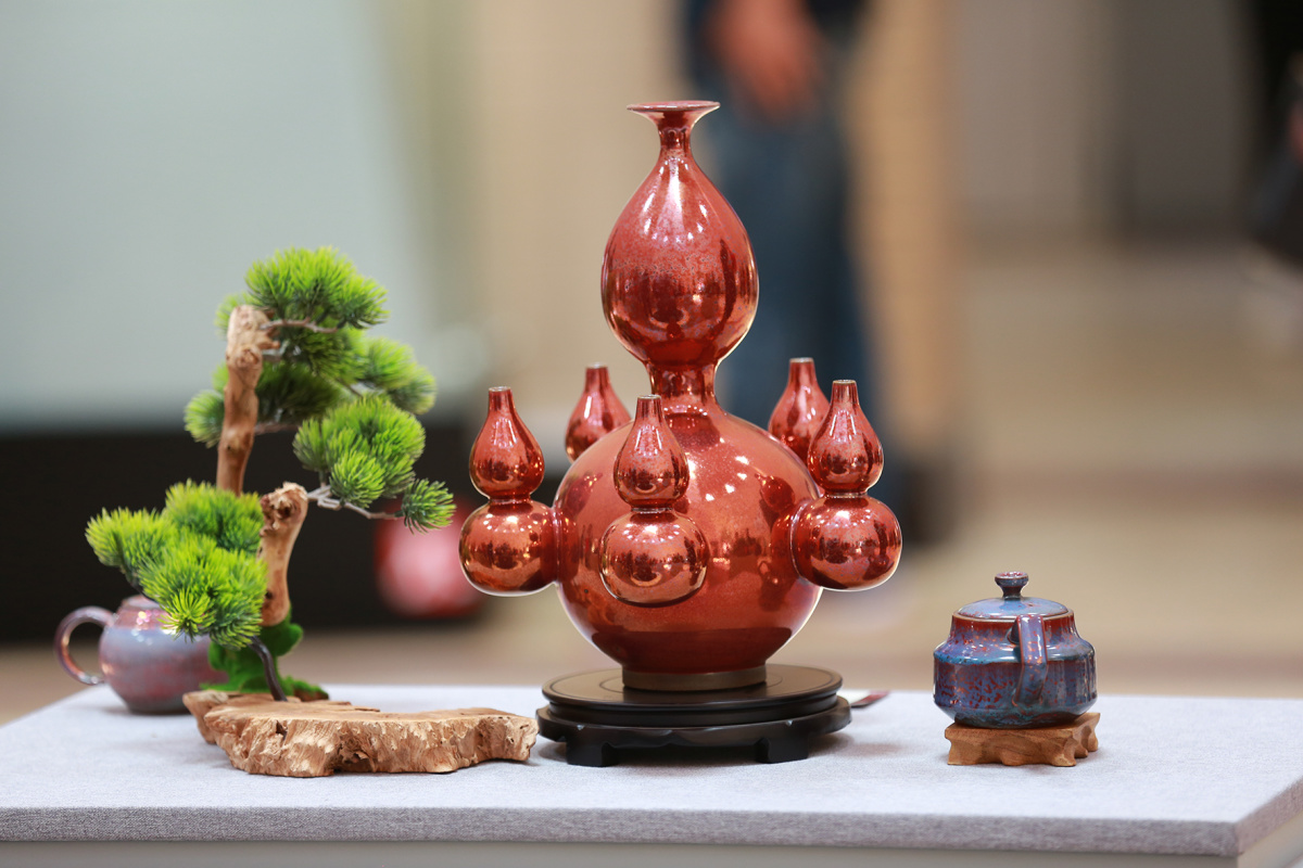 5月13日,位于禹州的中国钧瓷文化园展厅里人头攒动,观众们的目光集中在展厅中央的几件钧瓷作品上。这几件作品呈现罕见的金红色,在光照下闪耀着灿灿金光,引得观众们啧啧称奇、不停拍照。