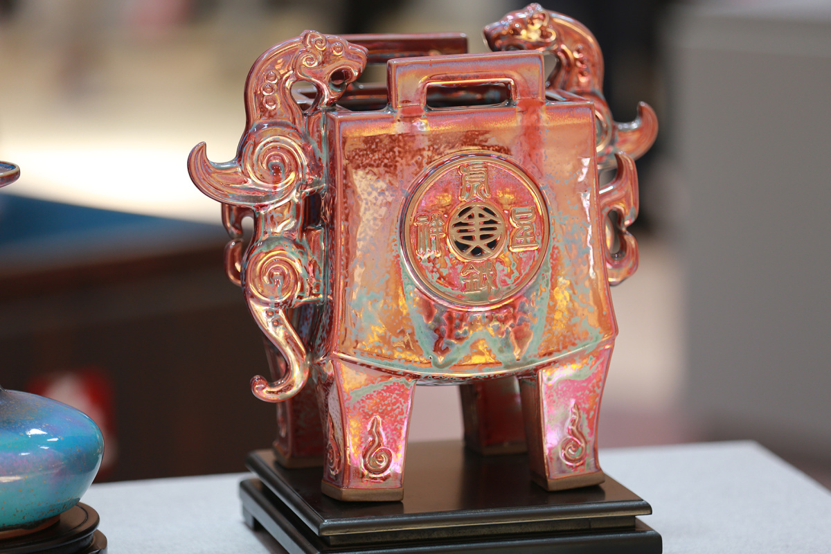 在这次成就展上,惊艳众人的“钧窑铜系金红釉”是首次发布。铜系金红釉作品色彩饱满,金光灿灿,厚重贵气,视觉冲击力强,给人高贵富丽的美学愉悦感。
