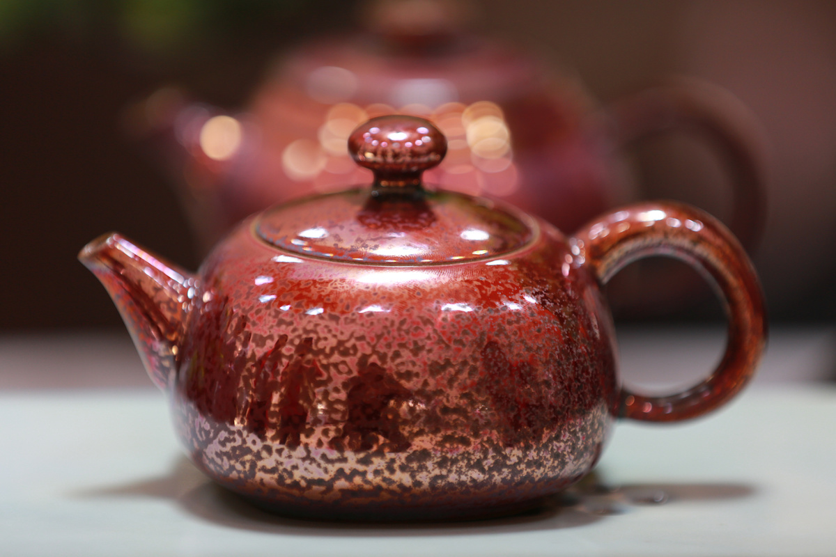 铜系金红釉是孔相卿经过数年攻关的最新成果,创造性地使用铜的氧化物替代黄金作为着色剂,在还原气氛下烧制成功,形成了稳定的钧窑金红釉烧制工艺体系。