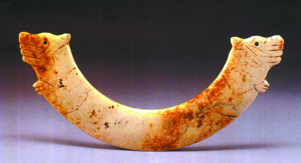 至少从仰韶文化时期开始,中国古代先民就已经对家养和野生的界线分得非常清楚,有了“我”与“非我”之分,“我”之所有包括家养动物,而“非我”族类,不是被狩猎的对象,就是被征服的对象,甚至连人都是。安徽含山凌家滩遗址(距今5600—5300年)出土动物遗存不多,但有虎骨遗存出土,应为狩猎所得,还出土有玉虎首璜和玉双虎首璜。其中,玉双虎首璜出土于凌家滩遗址1987年发掘的8号墓葬。玉呈灰白色,器扁圆弧形,璜两端各浮雕有虎首,用阴线浮雕刻出眼鼻嘴耳和脑门上的皱纹及向前扑的前爪,璜上阴刻花纹表现虎的花斑,造型独特,似猛虎上山。