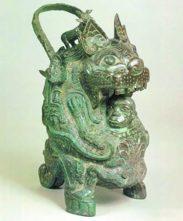 虎为食肉动物,所以,“虎有伤人意”乃其本性使然。古人通过艺术化的作品反映了这一事实,虎食人卣因其造型奇特、含义神秘而广受关注。迄今所见,虎食人青铜卣共有2件,分别藏在日本泉屋博物馆和法国巴黎色努施奇博物馆,据传均来自中国湖南。人虎母题的青铜器主要分布在中国西南和中原地区,如湖北、湖南、河南、陕西、四川等地。其内涵,有学者认为是虎噬人,也有学者认为是人虎交媾。张光直将人与虎解释为巫师和动物助手,陈星灿认为虎实为虎皮,所谓虎口之人当为披着虎皮的人,其现实来源当为人披虎皮狩猎或在仪式性活动中舞蹈和作法。